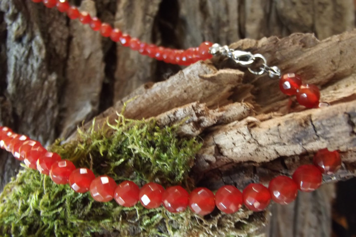 Délka je 44 cm.Kamínky jsou broušený,vel.5 mm.Karneol nás vede vědomě prožívat každý okamžik života.Jeho vitální energie v nás probouzí tvořivost,kreativitu ,schopnost proměnit nově získané poznatky ve skutečnost, aktivně myslet a jednat,aktivně žít.Pomáhá při křečový žilách,otravách krve,vnějším krvácení,revmatismu a stabilizuje krevní oběh.