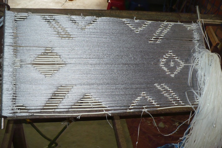 Ikat je tradiční metoda, kterou vzniká slavný kambodžský vzor "Hol Lboeuk". Nejdříve se hedvábné nitě napnou do rámu. Vpravo vidíte maskovací pásky (dříve se používaly proužky z banánových listů), kterými se příčným vyvazováním zakryjí ty plochy, které nemají být obarveny.