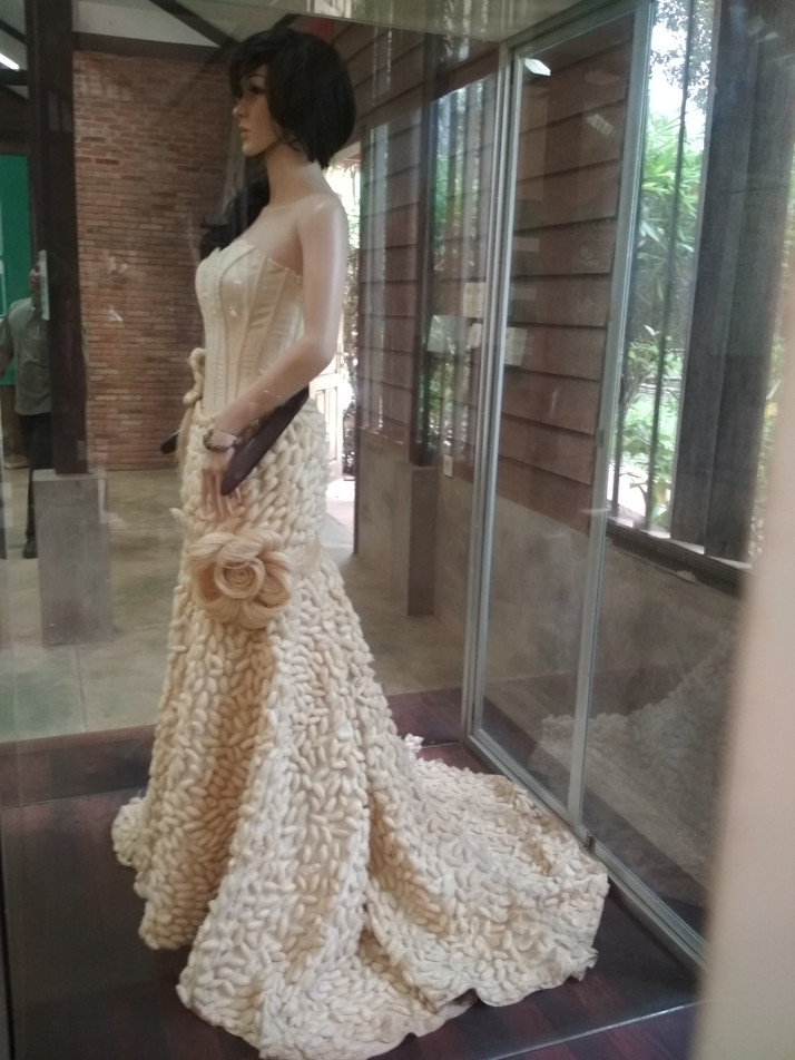 Perlička z muzea na závěr - hedvábná róba, sukně je ozdobená hedvábnými kokony.