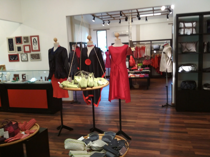 Prodejna výrobků, které se na farmě Angkor Silk Farm vyrábějí. Ceny šál se pohybovaly od 50 USD výše (Kambodžské království má sice vlastní měnu, ale běžně se všude platí v USD).