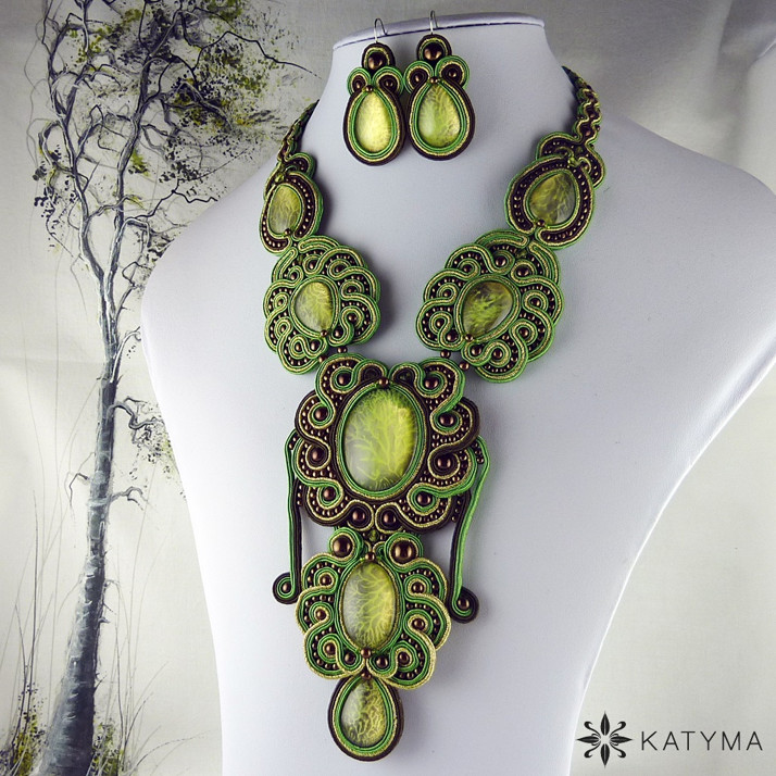 Komplet sutaškového autorského luxusního náhrdelníku a náušnic vytvořeného z nádherných kabošonů z obchůdku Malované kabošony.