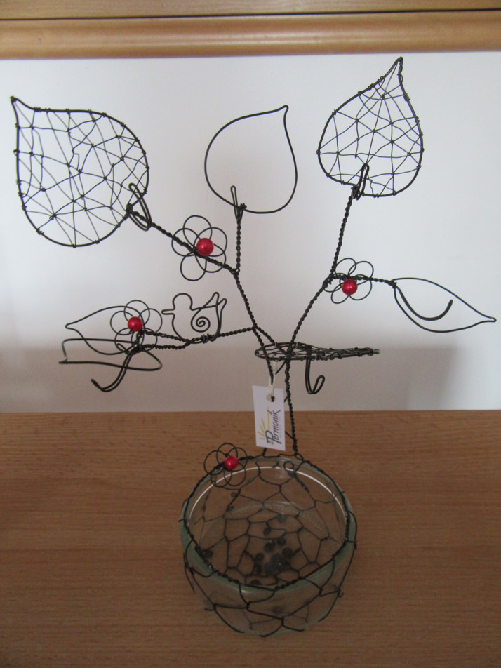 Černý drát, perleťové korálky, skleněná miska. Motiv stromu k zavěšení náramků, náušnic, prstýnků a dalších drobných šperků