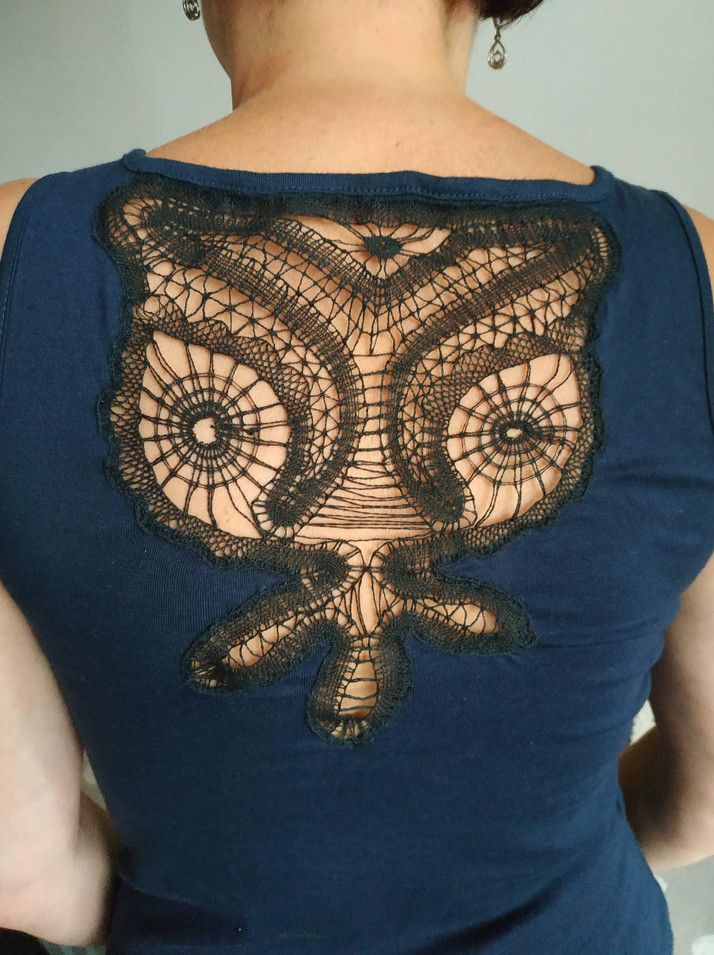 Tílko s všitou ručně paličkovanou krajkou na zádech