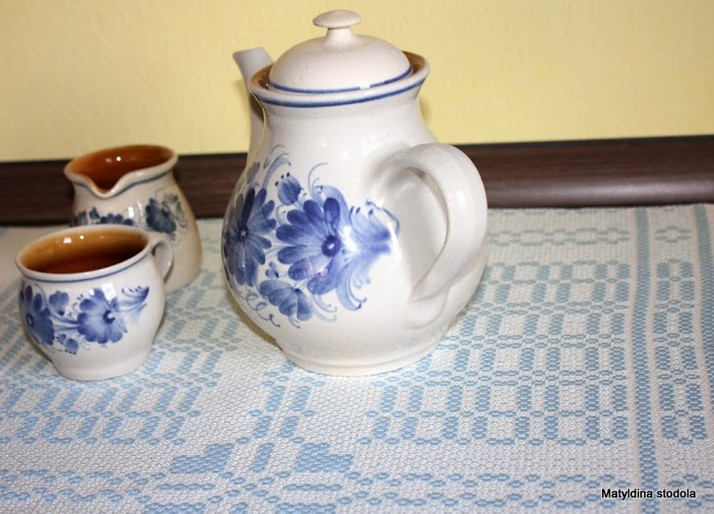 Ručně tkaný stolní běhoun navržený na míru Hrdějovické keramice. Utkáno z materiálu tuzemského výrobce.