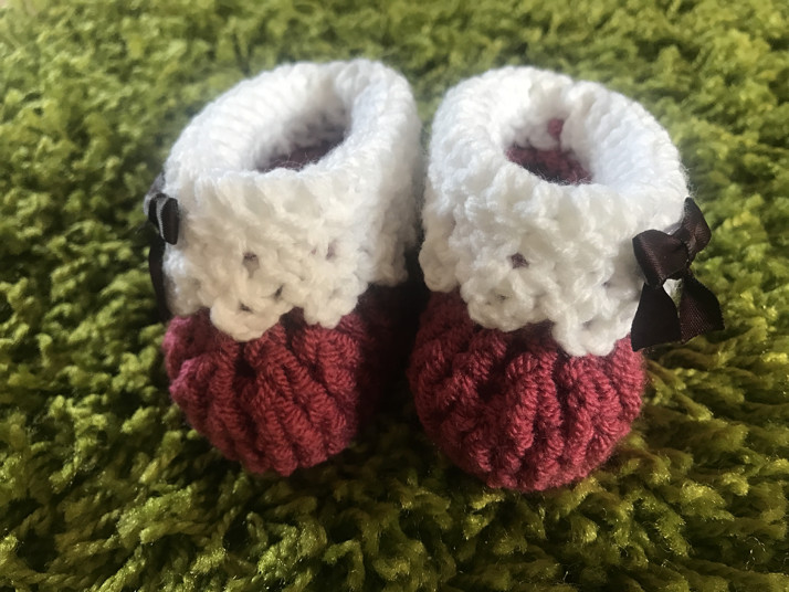 Krásné háčkované botičky pro novorozence a miminka do 4 měsíců. Bordo bílá barva s mašličkou.