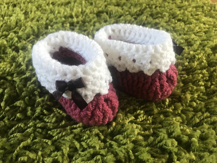 Krásné háčkované botičky pro novorozence a miminka do 4 měsíců. Bordo bílá barva s mašličkou.