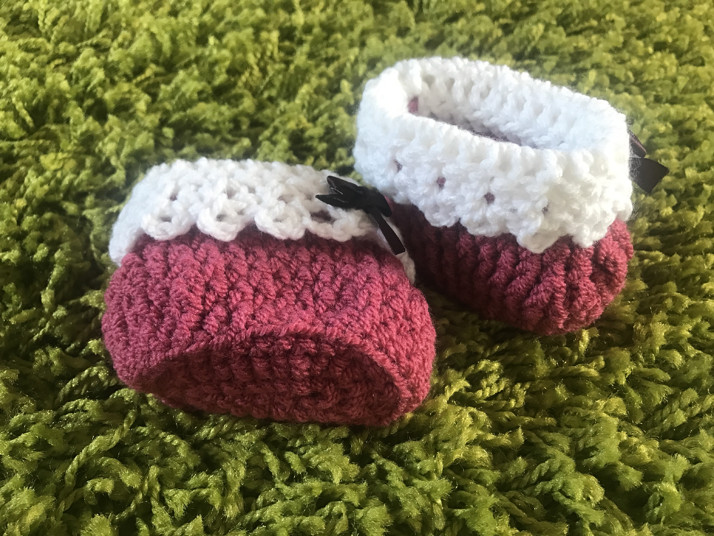 Krásné háčkované botičky pro novorozence a miminka do 4 měsíců. Bordo bílá barva s mašličkou.