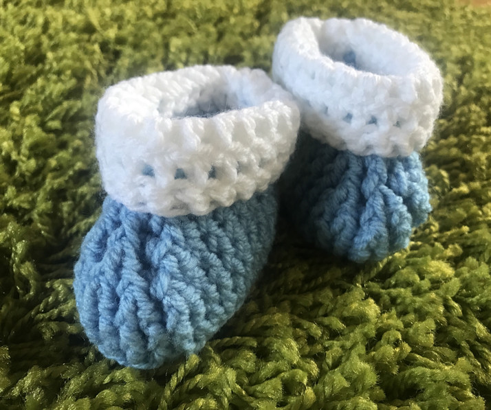Krásné háčkované botičky pro novorozence a miminka do 4 měsíců. Bílá modré.