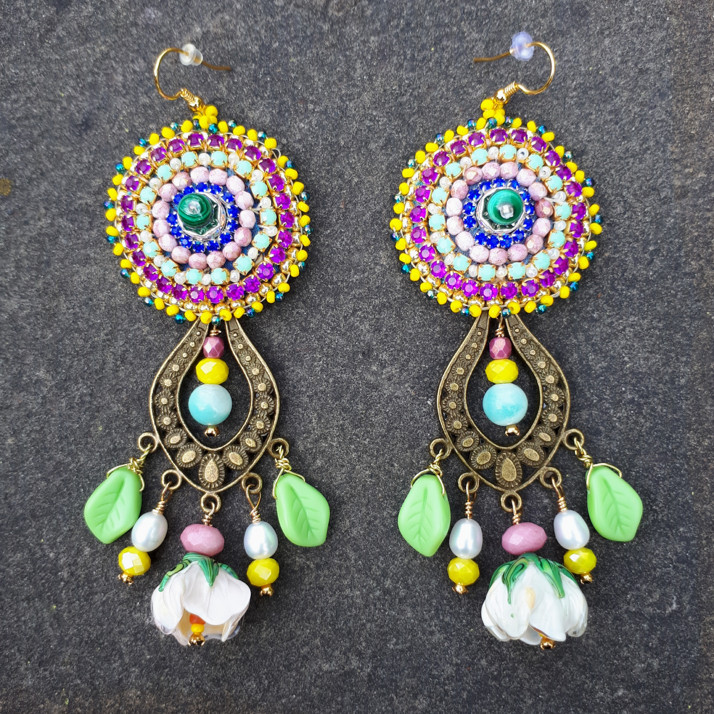 Bohémské vyšívané a drôtikované náušnice s filigránom a skleneným kvietkom