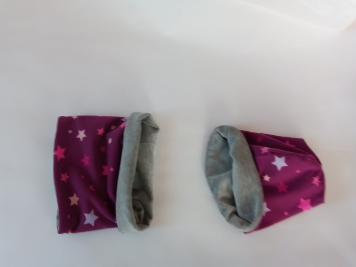 Čepice a nákrčník jsou šité z bavlny,mají dvě vrstvy. Pleteninu a dětský plyš