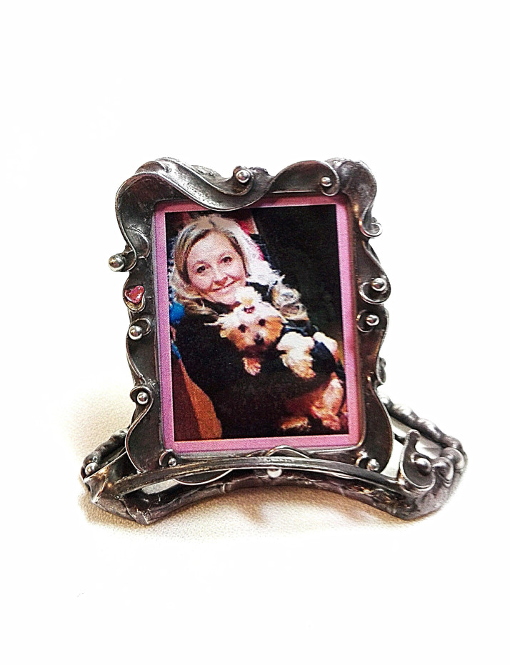 Tiffany vitráž, cínovaná jako šperk - oboustranný rámeček na fazetovém stojánku. Foto majitelky s písemným svolením.