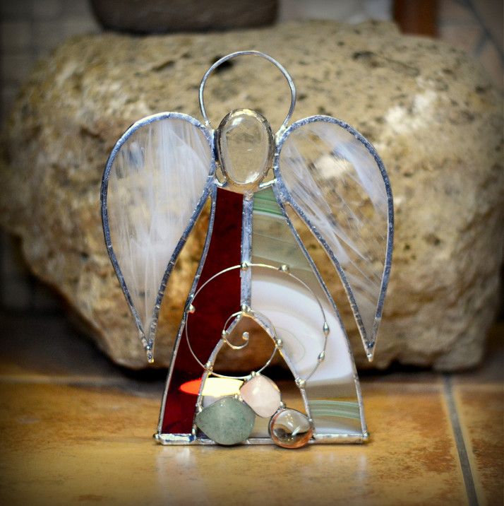 Zeleno-červený andělíček svícen s křišťálem, bílým křemenem a aventurinem