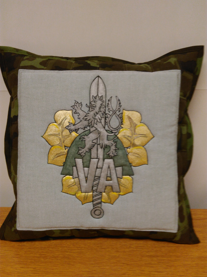 okolo maskáčková látka, malba barvičkami na textil