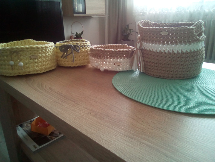 Nabízím háčkované kosiky ze špaget a šňúr rúznych tvarú a barev,ceny dle velikosti a druhu :-)