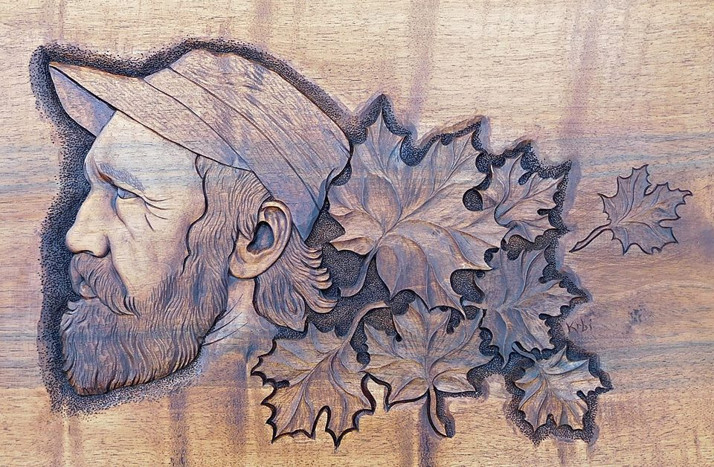 "Čas divnejch písní - portrét Wabiho Ryvoly" řezba do ořechového dřeva, rozměry 65x39cm, povrch Teakový olej.