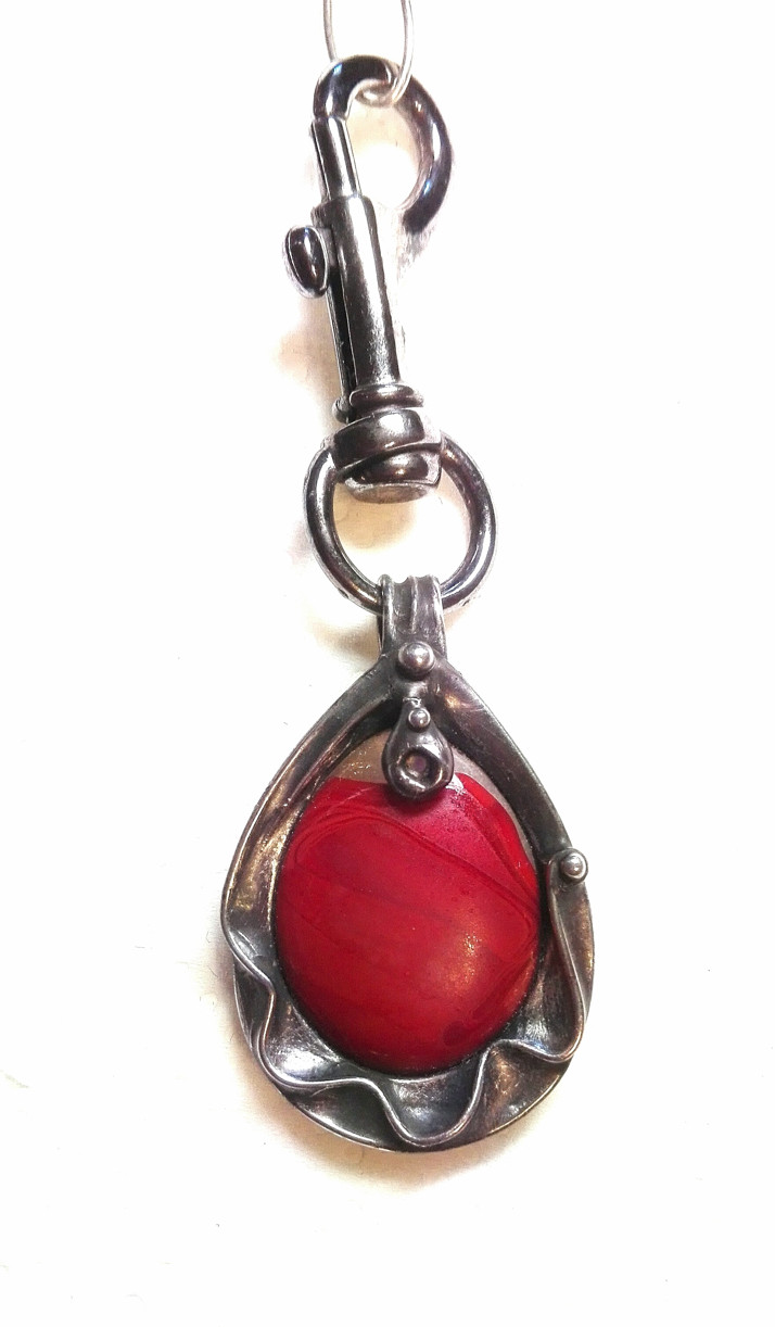 Krásný fusingový kámen zpracovaný jako přívěsek na karabině na klíče nebo na tašku. Cínovaný šperkařskou technikou