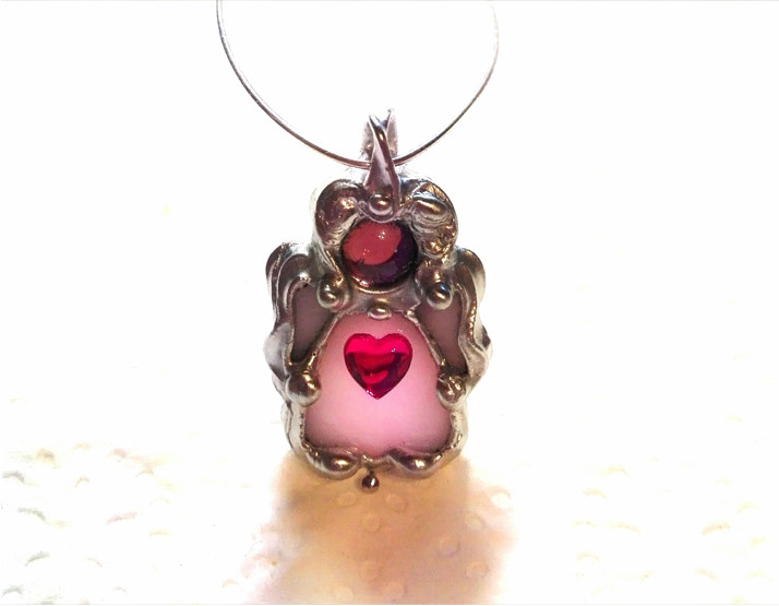 Autorský Andílek - amulet, ochránce, který vznikl spojením dvou technik... Tiffany vitráže a cínovaného šperku. Je to malinký ochránce na krk, do kabelky nebo peněženky, taky do auta