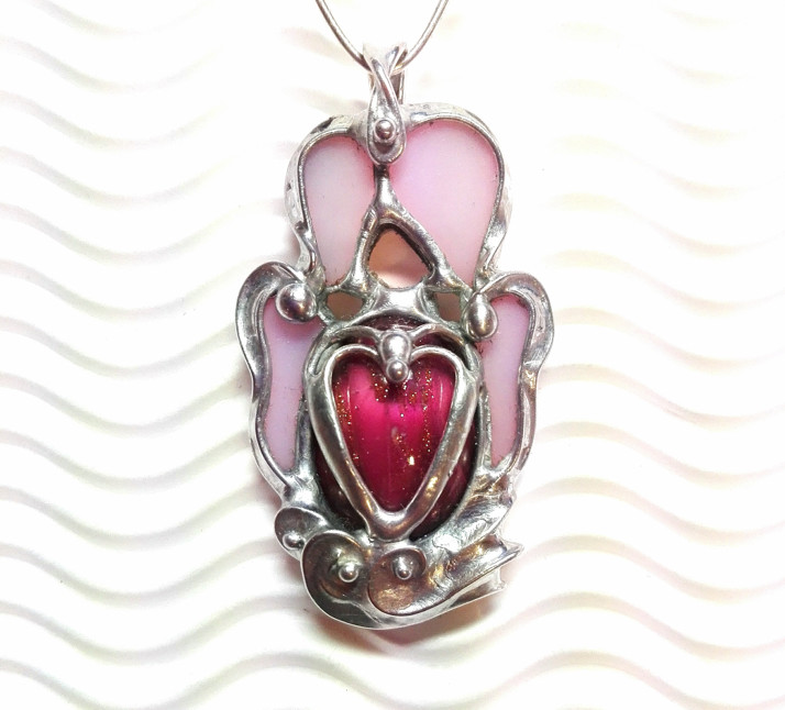 Autorský Andílek - amulet, ochránce, který vznikl spojením dvou technik... Tiffany vitráže a cínovaného šperku. Je to malinký ochránce na krk, do kabelky nebo peněženky, taky do auta