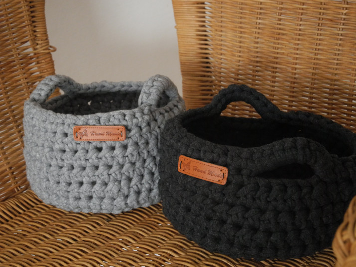 Košíčky háčkované z tričkové příze, antracitový a šedý. Průměr cca 16 cm, výška 10 cm. Košíčky jsou nejen praktické, ale hlavně příjemné a dekorativní.