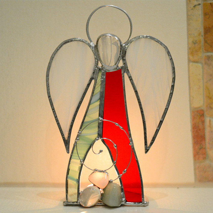 Zeleno-červený andělíček svícen s křišťálem, bílým křemenem a aventurinem