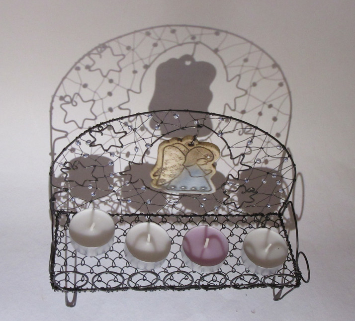 Tvořen s láskou z černého drátu, českého skleněného rokajlu a keramického andělíčka od Kronmon74. Čajové svíčky jsou součástí.