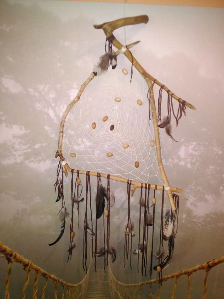 Lapač snů vyrobený starou indiánskou technikou za použití pouze přírodních materiálů, dřevěných korálků a pravého kohoutího peří. Vychytává negativní energii v prostoru.