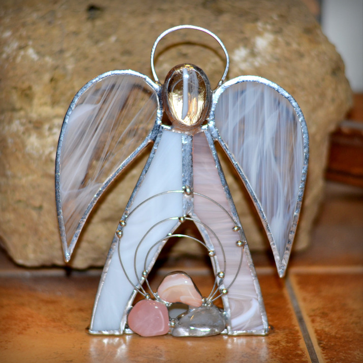Růžový andělíček svícen s mléčným křemenem, křišťálem a růženínem