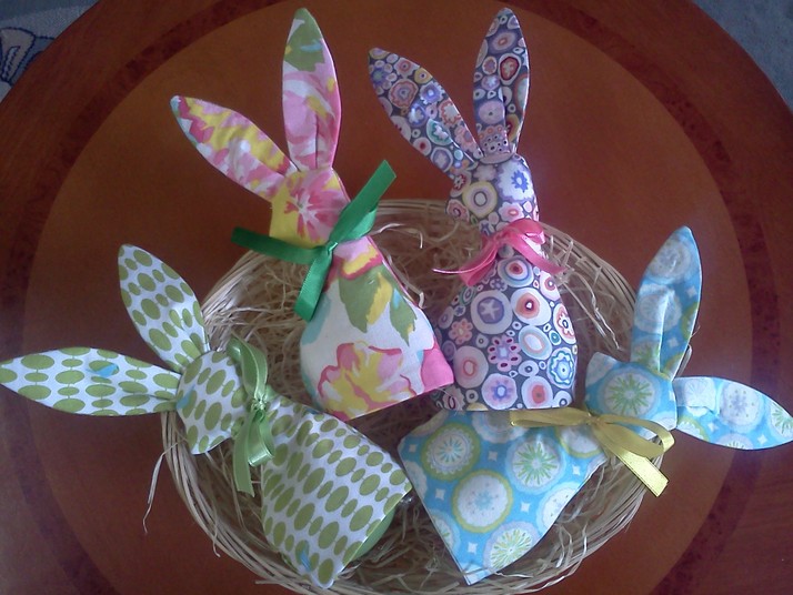 Krásná velikonoční dekorace od Dari :). Jak jsem byla poučena - dovnitř zajíčka se schová vajíčko a on pak krásně stojí :). A mě se líbí, že jsou všichni tak krásně barevně velikonoční :)))). A vůbec neva, že látka od Mellu je tam jen jedna :). Prostě to jsou fešáci! :))