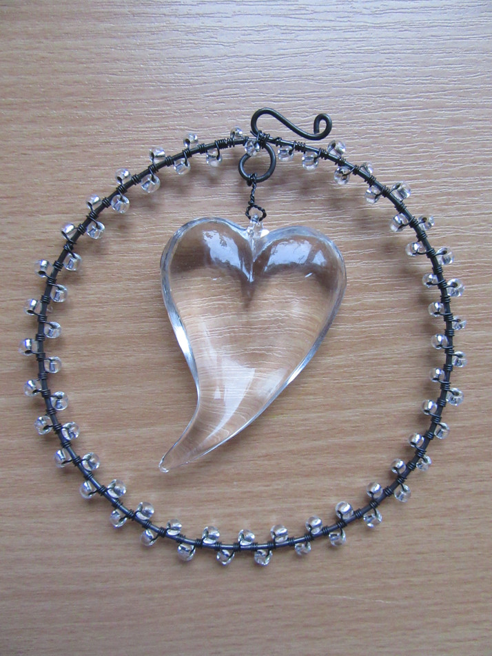 Velké skleněné srdce opletené čirým českým rokajlem.