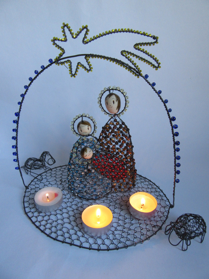 Keramické hlavičky vyrobila Kronmon74. Belký betlém z černého drátu obsahuje Svatou rodinu, jesličky, kometu, oslíka, čajovou svíčku, je variabilní.