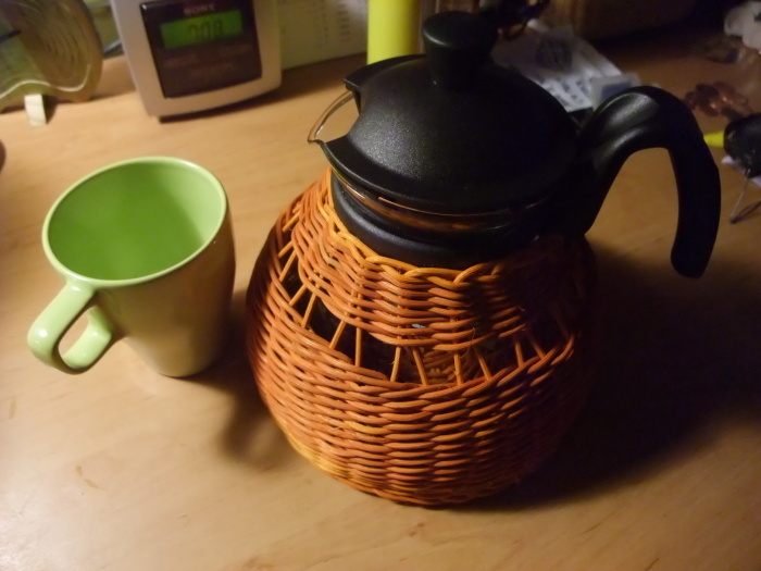 Skleněná konvice je opletená barveným pedigem v teplé banánové barvě. Velmi efektní pro zimní večery. Čajník lze mýt vodou.Slouží rovněž jako dekorace při servírování na stůl. Lze zhotovit v různých barvách a pro různé tvary konvic. Cena opletení je cca Kč 320,-.