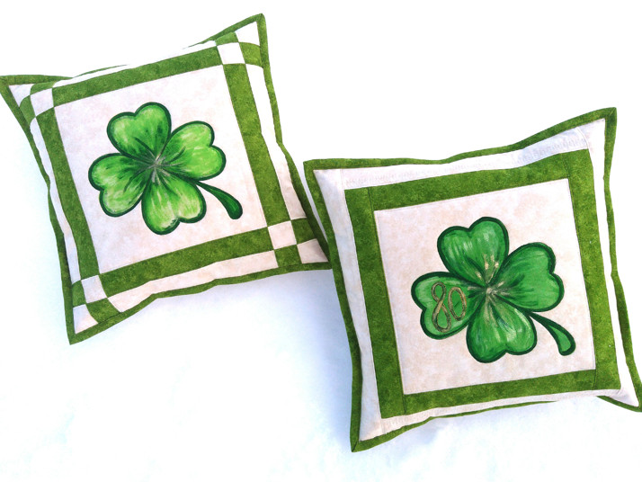 čtyřlístky malovány barvičkami na textil. Zafixováno zažehlením, poté prošito jako patchwork.