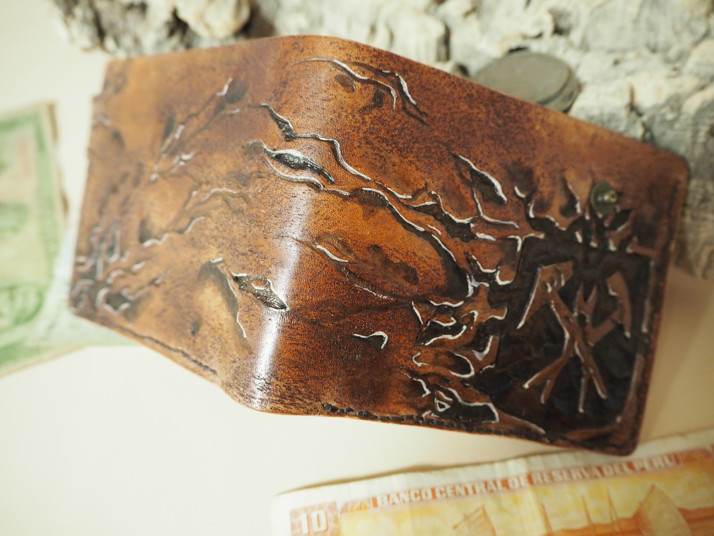 Peněženka s klempířskou tématikou. Hovězí třísločiněná kůže, syntetická nit, probarveno barvou na kůži