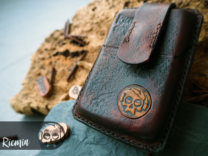 Hovězí třísločiněná kůže, syntetická nit, probarveno barvou na kůži.
