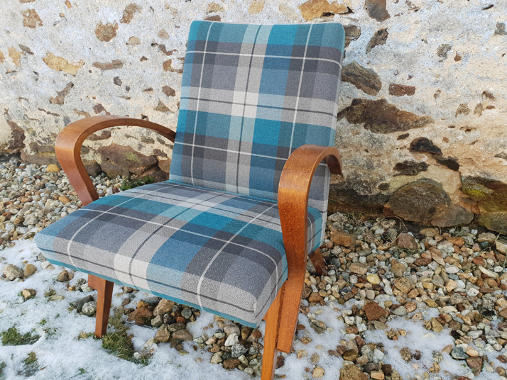 Renovace křesílka. Mimo drobných oprav v původním čalounění, jako nové popruhování, bylo v pořádku, dostalo pouze nové šatičky.
