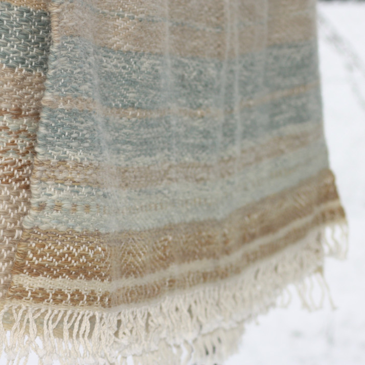 Utkaný z ručně předené a přírodně barvené příze z vlny valašek. Má nadstandartní velikost a proto byl utkaný jako přeložená tkanina.
