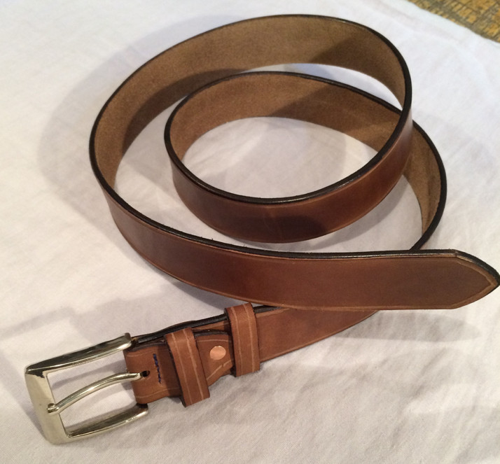Pánský opasek z hovězí hlazenice, ručně barvený a šitý. Zakázková práce.