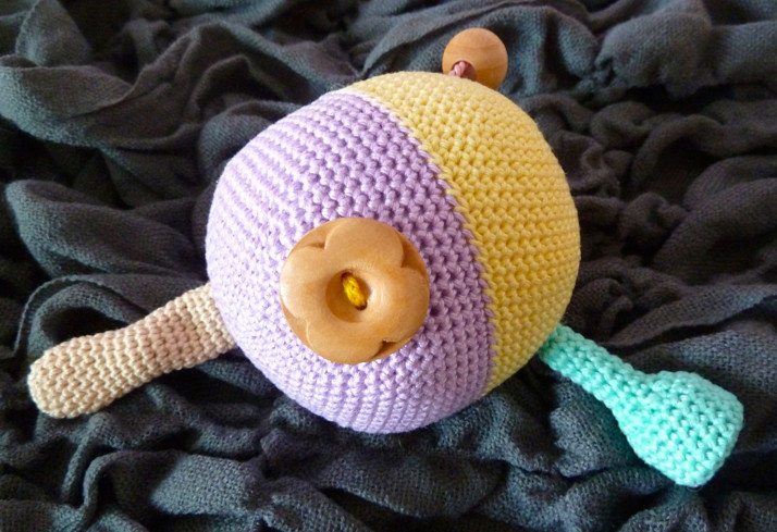Uvnitř těla hračky atestovaná zvonkohra, obháčkovaný korálek v nohavičce, březový korálek na kroucené šňůrce, dřevěný knoflík a obháčkované chrastítko.