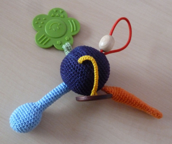 Uvnitř těla hračky atestovaná rolnička, modré pískátko, zelené kousátko, žlutá kanička s velkým knoflíkem, obháčkovaný korálek v oranžové nohavičce a červená pružinka s oválkem, kterou se dá protáhnout knoflík i zelené kousátko se strukturovaným povrchem pro snažší prořezávání zoubků a žlutý klips k zavěšení.