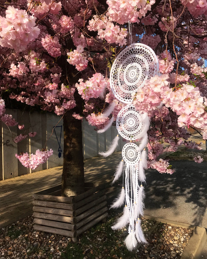 Velký sněhově bílý lapač s vyšívanými třemi koly. Byl to takový hokus pokus, několikrát předelávaný. Alespoň že už je venku krásně a mohu využít i jiné pozadí. :-)