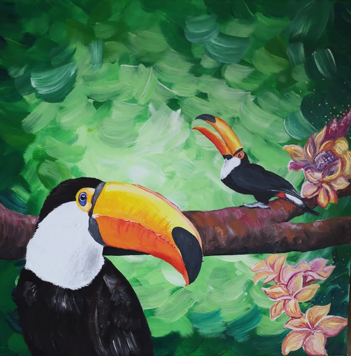 Dva tukani v pralese jsou malovaní výraznými akrylovými barvami na plátno o rozměru 40x40 cm.