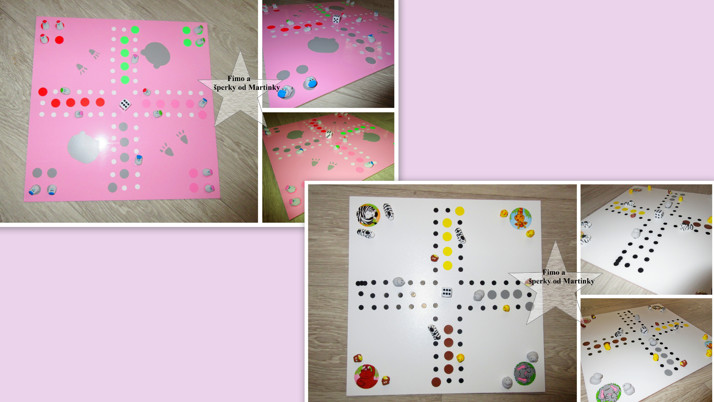 Oboustranné člověče, nezlob se. Na 1. straně méďové a na druhé zvířátka ze zoo. Cena 450 kč. Plán hry je pevný, neohebný- sololitová deska - velikost klasické hry: 32x32cm
