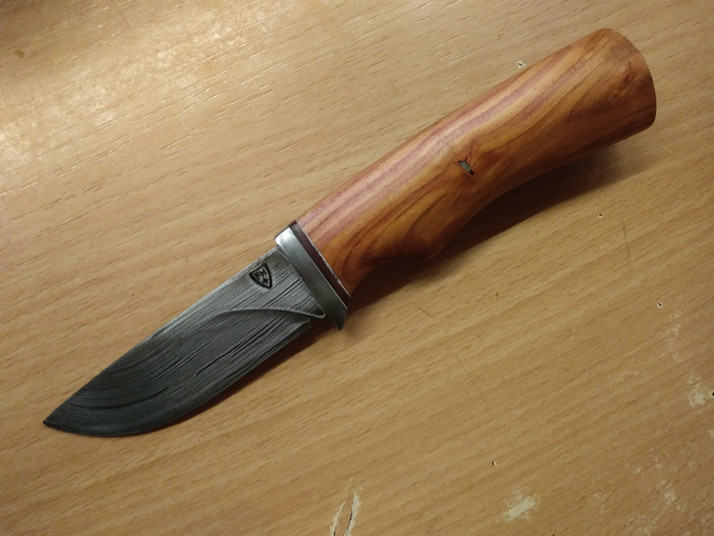 Jemný lovecký nůž, vykovaný z řetězu motorové pily, s rukojetí vybroušenou ze švestkového dřeva
