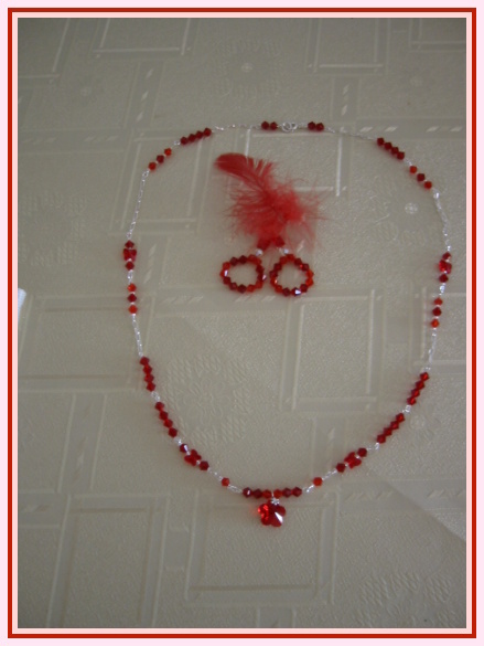 ..náhrdelníček*naušnice* tvořeno ketlováním z stříbrných bižuter.komponentů a sluníčka 4 mm,motýlek swar.6mm červená siam a kytičky 8mm siam swarovski...prostě motivace siam.červenou barvičkou*