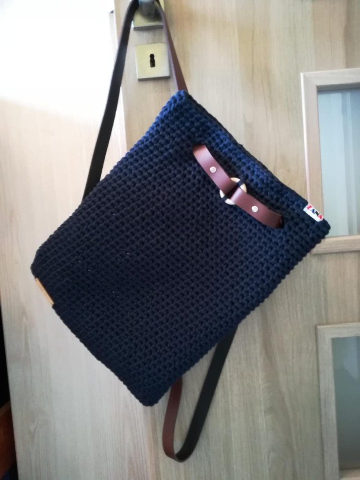Ručně háčkovaný městský batůžek 30x40cm s koženými popruhy na šroubek