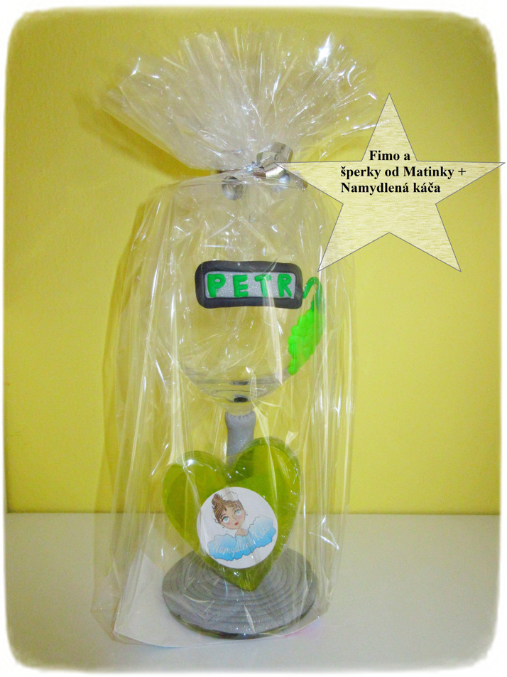 Sklenička na víno PETR s krásným zeleným průhledným mýdlem od " Namydlené káči". Cena 150 kč- SKLADEM