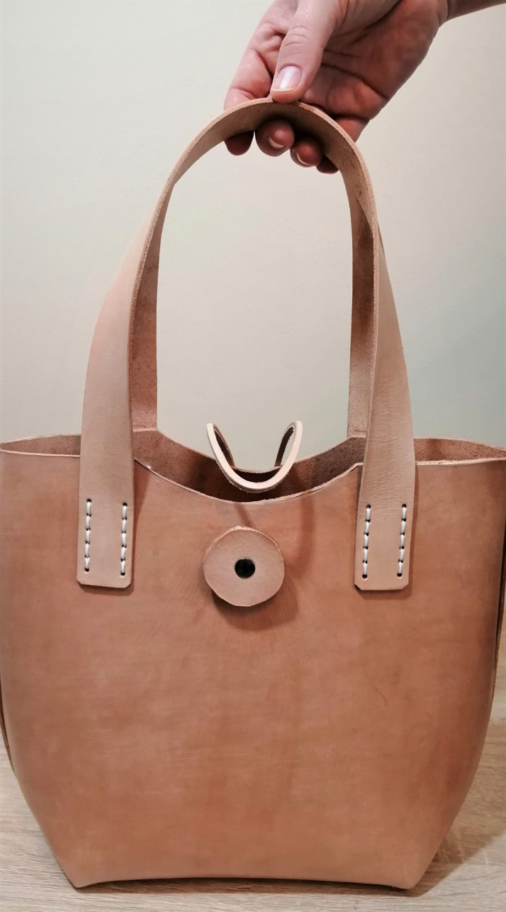 Kabelka má praktické a elegantné zapínanie, ktoré je spravené iba z kože, pripevnené z jednej strany k telu kabelky jedným skrutkovacím nitom. Kabelka je ručne šitá, vyrobená z hovädzej kože - prírodná hladenica o hrúbke 2-2,5 mm; 1. trieda kvality kože od slovenských malých lokálnych chovateľov. Určite si ju zamilujete, stane sa vaším každodenným spoločníkom.