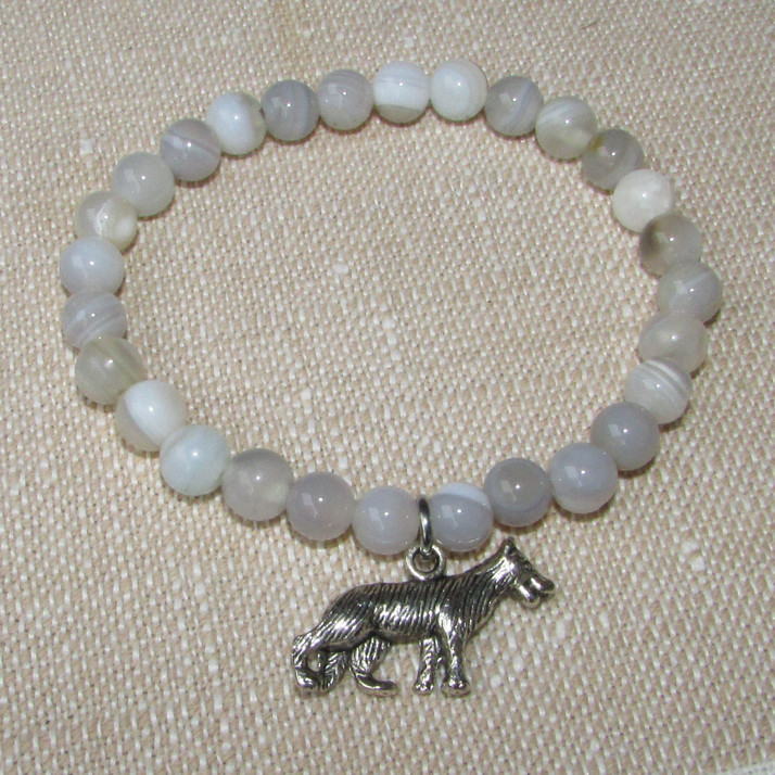 Náramek z korálků šedého achátu s přívěskem vlčáka