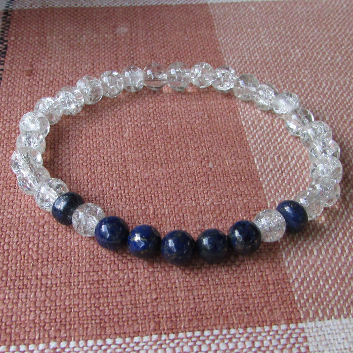 Náramek z korálků praskaného křišťálu a lapisu lazuli o průměru 6 mm.