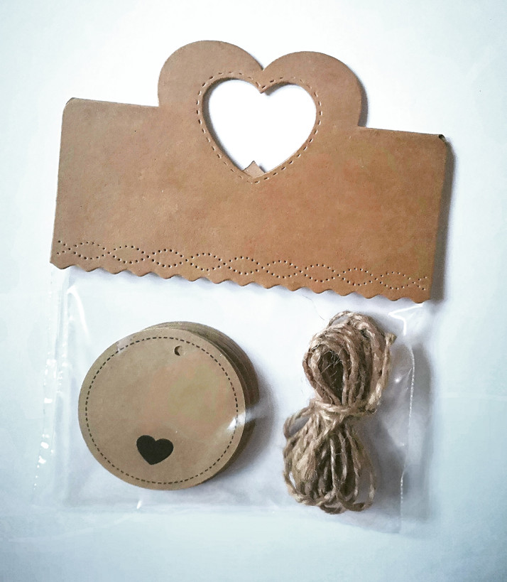 Přírodní visačka ve tvaru kolečka se srdcem.